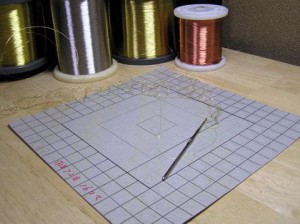 技法は「編」。鈎針を用い、ステンレス・黄銅・銅の細い線が作品を構成していきます。“緊張”が欲しい作品には真鍮線。銅線はやわらかくどんな形にでも“変化”してくれます。“透明感”には細いステンレス線を使います。それぞれの金属が持つ色の美しさ 色合いをも楽しんでいます。鈎針で編んで生まれてくる形が、予想に反してびっくりする面白い形になっていたり。そのときはそれに委ねることにしています。