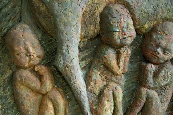 「幼い子どもの顔です。赤ん坊ですかね。そのオブジェです。」「そして、顔というのは誰がみても顔なんです。なにで作ってあってもそれが石膏や金属の塊だとは感じない。顔として感じる。」その言葉どおり、観覧者はひとりひとり違う子どもの顔を見る。どの子にも共通していることも見る。
