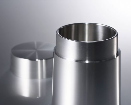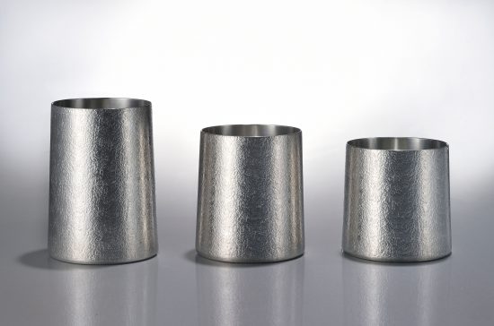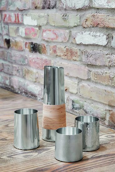 金属加工は、ラッパ状に先の広がる形状が一般的。上に行くほど口を狭める職人泣かせの技法は難度が高く、何気ないようでいて非常に挑戦的な試みです。またいずれの作品もラース氏のおこしたデザインを忠実に再現しつつ、錫が持つ質感や重量感、形状の美しさなどを最大限に表現できるよう心をくだきました。