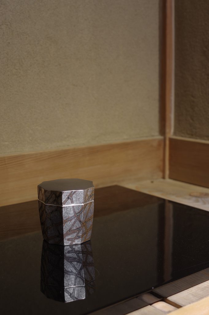 素材には、赤銅(銅と金の合金)や四分一(銀と銅の合金)などの日本古来の合金を用いて、金属の色彩による有機的な文様の表現を試みた。また、制作する上で、ひとつの作品の中に密と疎、静と動などの「相対する要素」を入れ込んで景色を作り出すことや、金属特有の鋭いエッジ取り入れたデザインにし、作品に立体感や動き、リズムを与え、模様の見え方により変化をつけることを意識し模様に奥行を出している。