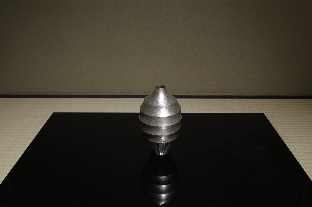 This is a flower vase created by employing the technique of the pattern welding “Mokumegane” which was invented in the 17th century in Japan.