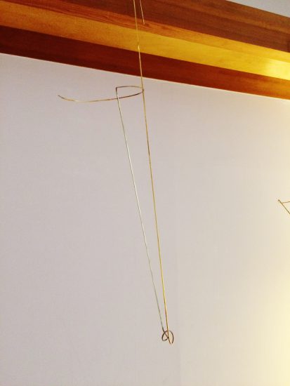 ある程度平面のドローイングをしてから、その感覚を素に3日目からは並行して細めの真鍮棒を使った立体的なドローイングを始めました。施設には火が使える設備は無かったので、簡易のハンドバーナーを持ち込み、ヤスリで切り込みを入れたり熱で柔らかくした金属を曲げたりして工夫しながら形を作っていきました。360度、どの角度から見ても美しい線やリズムを意識しながら真鍮棒を曲げていきました。最終的には出来上がった繊細なフォルムが際立つよう、壁から吊り下げて展示することにしました。