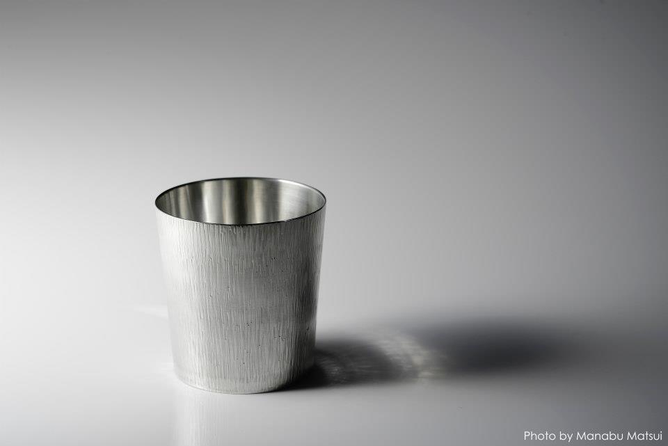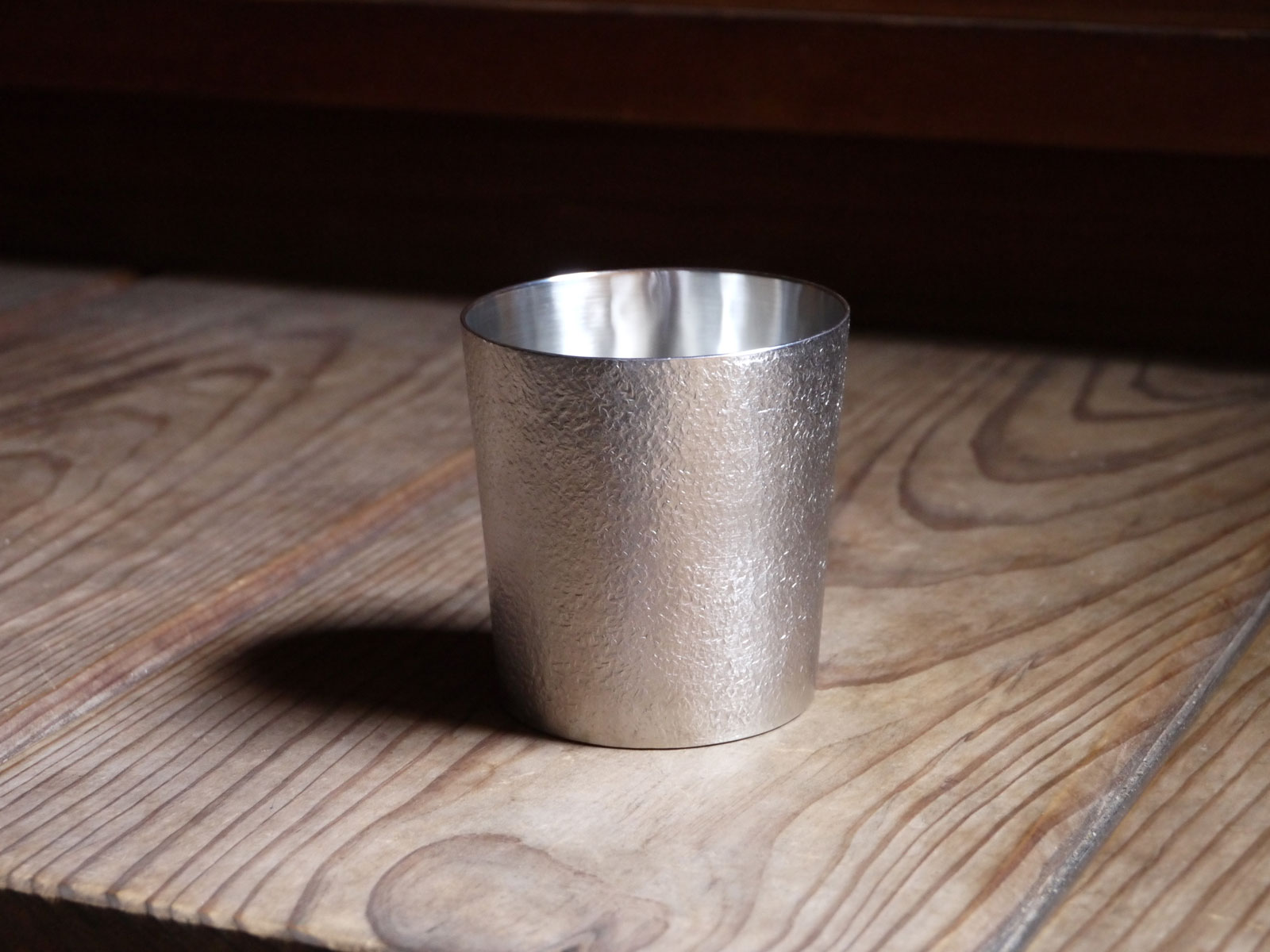 拳大ほどの丸い氷を入れてウィスキーを飲みたい、とのお客様の声から生まれたカップです。シンプルな形状で、金鎚の跡を活かした清課堂の得意とする鎚目仕上げにしました。
