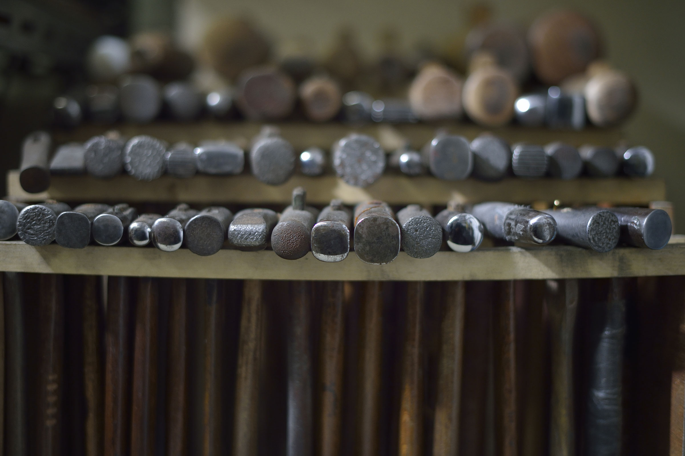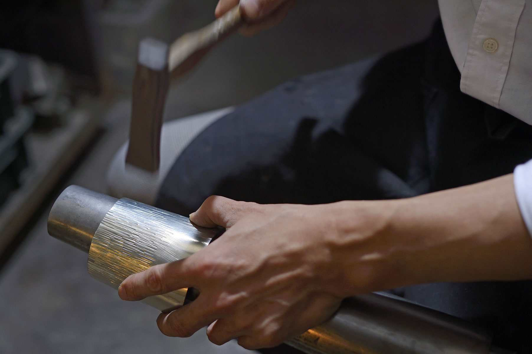 肌合いも弊堂の伝統的な、鎚目(つちめ)を施しています。鍛造品ならではの、手なりの味わいが特徴です。光の具合によって、キラキラと輝きます。