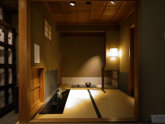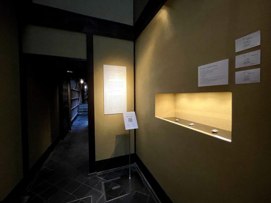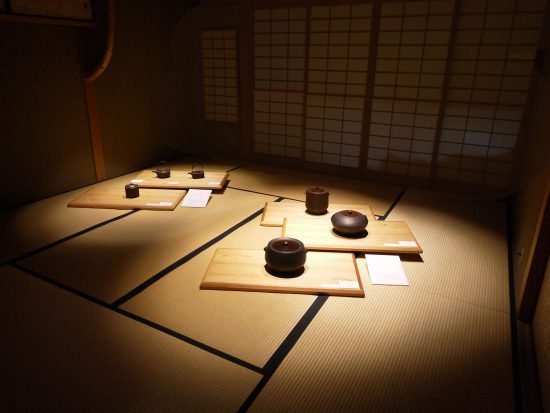 簡素な作りの茶室ならではの展示。靴を脱ぎ畳に上ってみていただくことで、作品に寄り添うことが出来ます。とくに茶の湯道具や床飾りの作品は、この場所に映えた展示となりました。