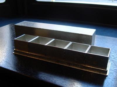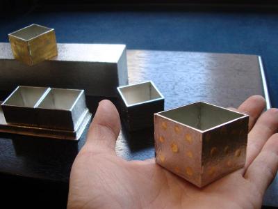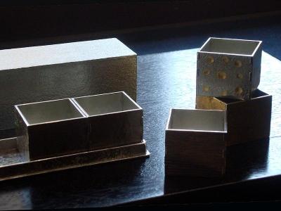 樽から出してすぐの酒を桝で呑むことをモチーフにした、おめでたいしるしの杯です。所々に純金箔をもちいて着色してあるのも特徴。 弊堂に入社二年目になる最も若い職人が製作、2009年の秋に開催された「工芸都市高岡クラフトコンペティション」に出品し入選した作品です。 従事してまだ間もない未熟者ではありますが、就業後の手間と時間を惜しみなくかけて作り込み、また細部にいたるまで気を配ってでデザインされたなかなかの逸品です。見どころは、単に板を張り合わせただけでなく、指物の様に板と板あわせる際に互い違いになるようにする桝組をデザインの一部として取り入れたところでしょうか。肌のアクセントにもなって、大変美しく作られました。 (錫98%・銀2%、鍛造製) いつもは、定番の「迎春用屠蘇器揃」が店を飾るところ、今年は違ったハレの器を展示してみました。