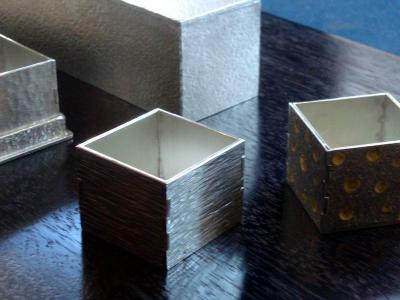 この新春、年のはじめに弊堂ショーケースを飾りますのは、創作の品「MASUGATA ぐい呑み」の酒器揃いです。錫製の5つの模様・色違いのぐい呑みが、同じく錫製の蓋付きの箱にぴったりと収まる様に出来ています。