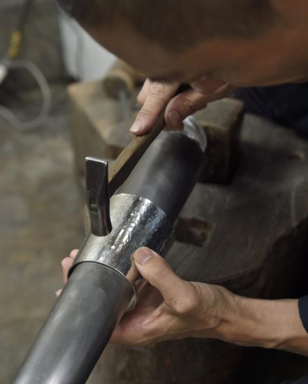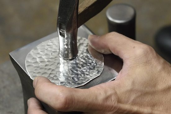 成排的平緩凹凸就像是鏡面球般光線漫射,成為鎚目特有的韻味。只要改變鐵鎚的鎚頭凸起大小、敲打鐵鎚的力道、使用的材料厚度等,就能創造出各式各樣的鎚目。