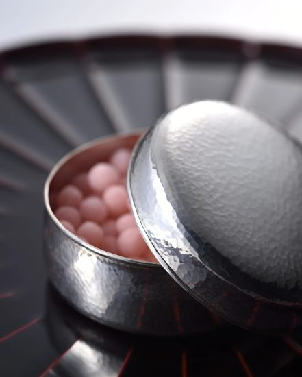 「純銀糖果盒」。手掌大小般的小容器,表面施以非常細緻的鎚目。