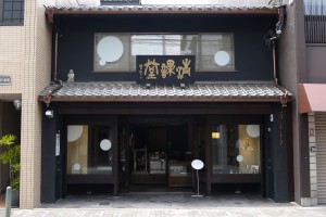 今回の展覧会に際して、清課堂は道路に面した店構えにちょっとした趣向を凝らしています。 展覧会ご案内ハガキにも共通したデザインで、お皿をイメージさせる「サークル:円」の装飾をショーケースなどガラスに加えました。