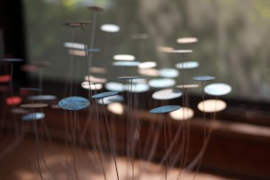 窓際で、そよ風に揺られるオブジェ。銅のさまざまな発色が美しい作品。