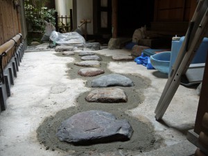 清課堂の両隣、後ろにビルがあるせいで、もともと通気性を考えて作られた京都の古い家(町家:表屋)の作りは凍てつくような寒さに見舞われます。平成25年3月の展覧会までは、少しの間お休みを頂戴します。 その間、茶室ヘ向かう通路・露地では現在、飛び石の修正を行っています。 伝統的な作りを踏襲した配置・大きさで美しい空間ですが、多くの方が蹴つまづかれる難点がありました。伝統の茶室の作りと障害の無いユニバーサルな作りとを天秤にかけて悩みに悩んだ結果、この飛び石を修正することに決めました。地面(たたき)から4センチ以上飛び出ていた石を沈め地面から1~2センチのみ出す、見た目を考慮しながらも段差を極力減らす工事を施しています。併せて、店舗から奥へつながる通路にある階段にも、手すりをつけています。 年内には完成の予定で、来年の展覧会開催時には皆様にご披露できるかと思います。どうぞお楽しみに。 (Yamanaka)