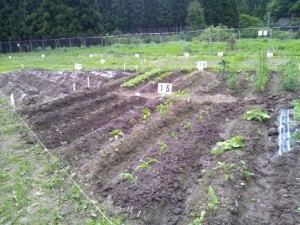 下の写真は農作業終了後の写真です。添えの支柱も立て、すくすく育ってくれるのを願うばかりです。画面左奥の新しく作った畝には、次回S工場長自らサツマイモの苗を植えに行っていただく予定です。