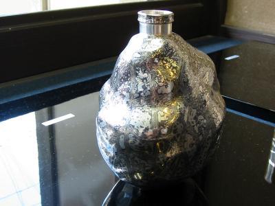 佐故龍平さんはこの技法を得意とし、銅、銀と共に、非常に堅牢で、形成、加工が難しい四分一という金属を使っています。四分一とは銅が3/4 銀が1/4の合金で“朧銀・おぼろぎん”ともよばれます。この金属は、細やかで渋い灰色や黒色の階調を生み出す事ができ、モノトーンの渋い色調で清楚な繊細な木目金を作りたかった佐故龍平さんの感性と共鳴したのです。