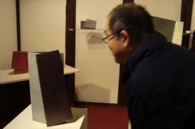 メインとなる蔵展示場は、代表作「BEND series」を展示しました。ここは弊社創業当時より伝わる土蔵を改良した、高い天井、ベンガラ色の柱が特徴的のスペース。ここでは彼の近年のシリーズで、曲げる・折るという行為そのものが体を表している作品を集めました。ここでは、多くの来場者が既視感をもってこの作品を視ていたようで、作品からそれぞれ、織物、染物より伝わる美しさと似ている気が感じられました。それら気は、着物から感じる柔らかさや軽さ、紳士服の襟元にある礼儀正しさではないでしょうか。この「BEND series」は30cm四方以上の大きいものから、手のひらに載るような小さいタイプまで用意されていました。