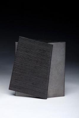 彼の近年を代表するシリーズ、BEND。 アルミニウム板を『折る』ことによる造形美。 見る人には、織物のようとも評されることが多かった。 多彩な色彩を見せるが、これは着色や塗装、めっきの類とは一線を画する、染色だと彼は言う。電子顕微鏡レベルではアルミニウムの素地表面に数多くの孔があいており、その中に染料の元ととなる顔料成分が入り組んでいるのだそうだ。 この展覧会では、手のひらに乗るほどの小さいものから、一抱えほどある大作までおよそ40点ほどのBEND新作にとりくんだ。