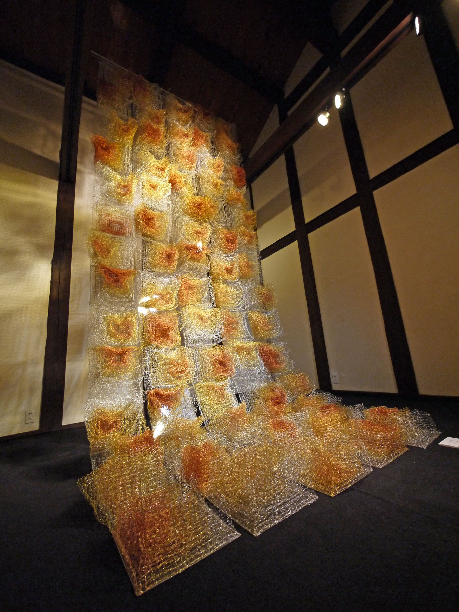 彼女は私の母であり、私自身も幼い頃からその創作活動をずっと傍らで見てきました。彼女の鈎針を使ってステンレス線、真鍮線、銅線を編んでゆく手法は細かい地道な作業で、一日に形になる量もごくわずかです。毎日毎日朝から晩まで編み続け、何年もかけて背丈の何倍もあるような大作が出来上がります。これは想像を絶するような時間と労力のいる根気を要する作業に見えますが、自由気まま想い描いたものを形づくってゆくことで本人はいたって楽しそうです。彼女の地道な作業の先にあるつくることの楽しさ愛おしさを、作品を通して感じていただければ幸いです。
