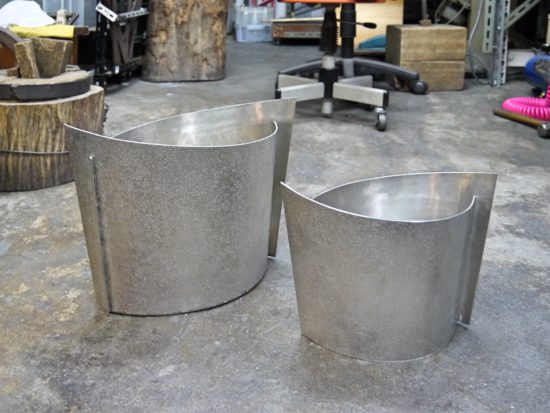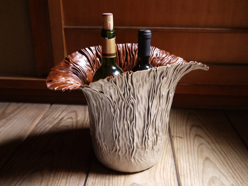 銅製のクーラーいろいろ。こちらは一品限りの特製品となります。大小、いろかたちはさまざまにオーダー承ります。皮や木の肌に似た有機的な肌合いが特徴です。漆を焼き付けて着色を施したり、金・銀・錫箔など金属箔を押しての装飾されたものもあります。