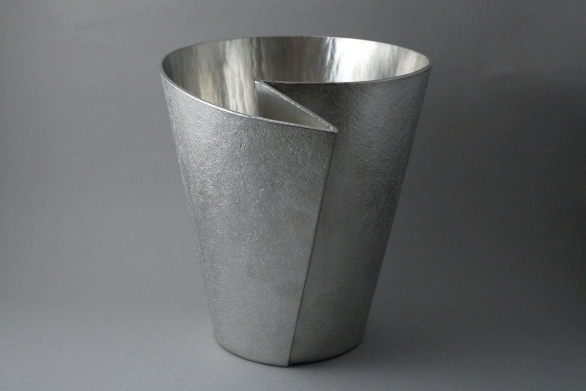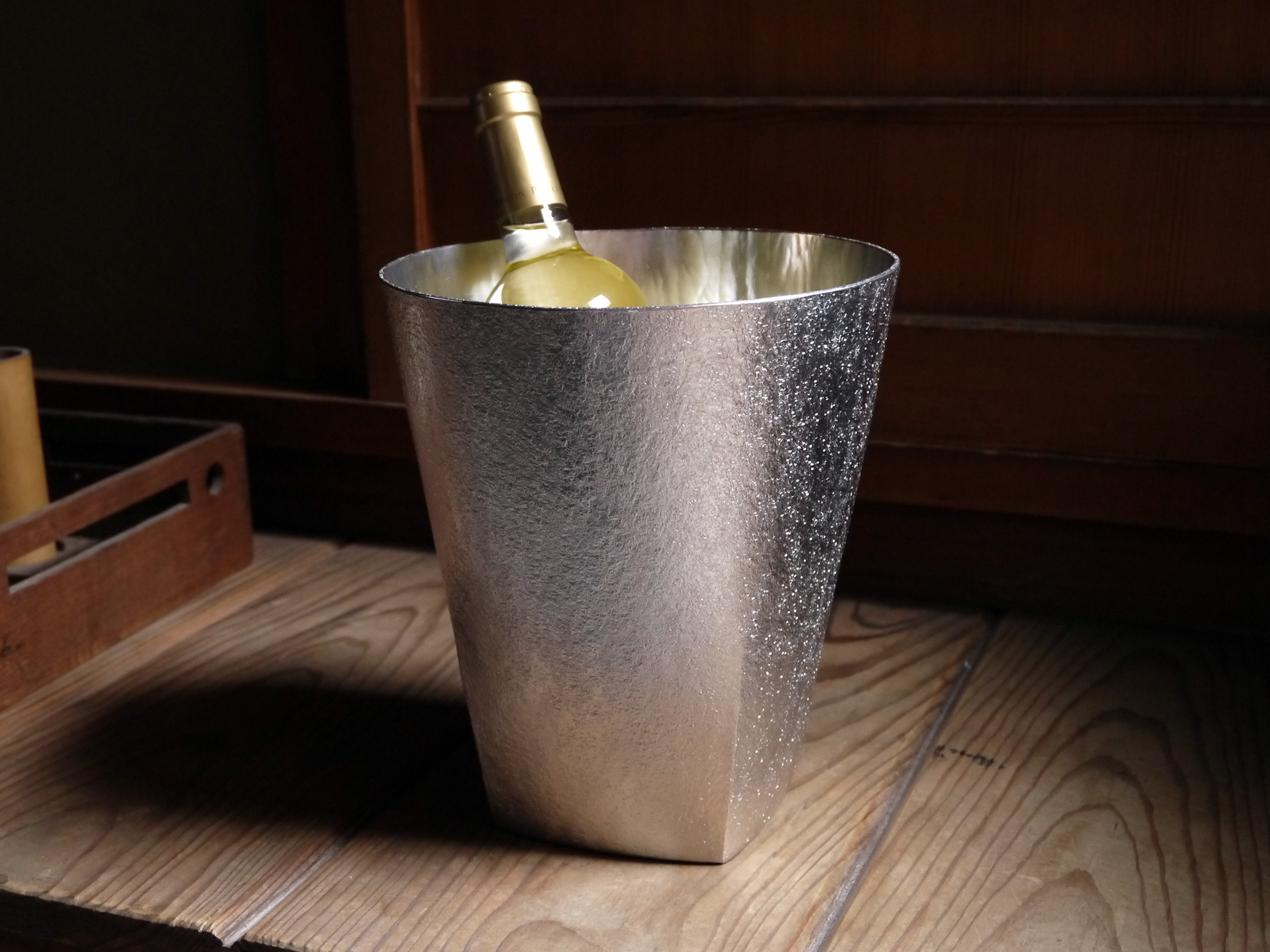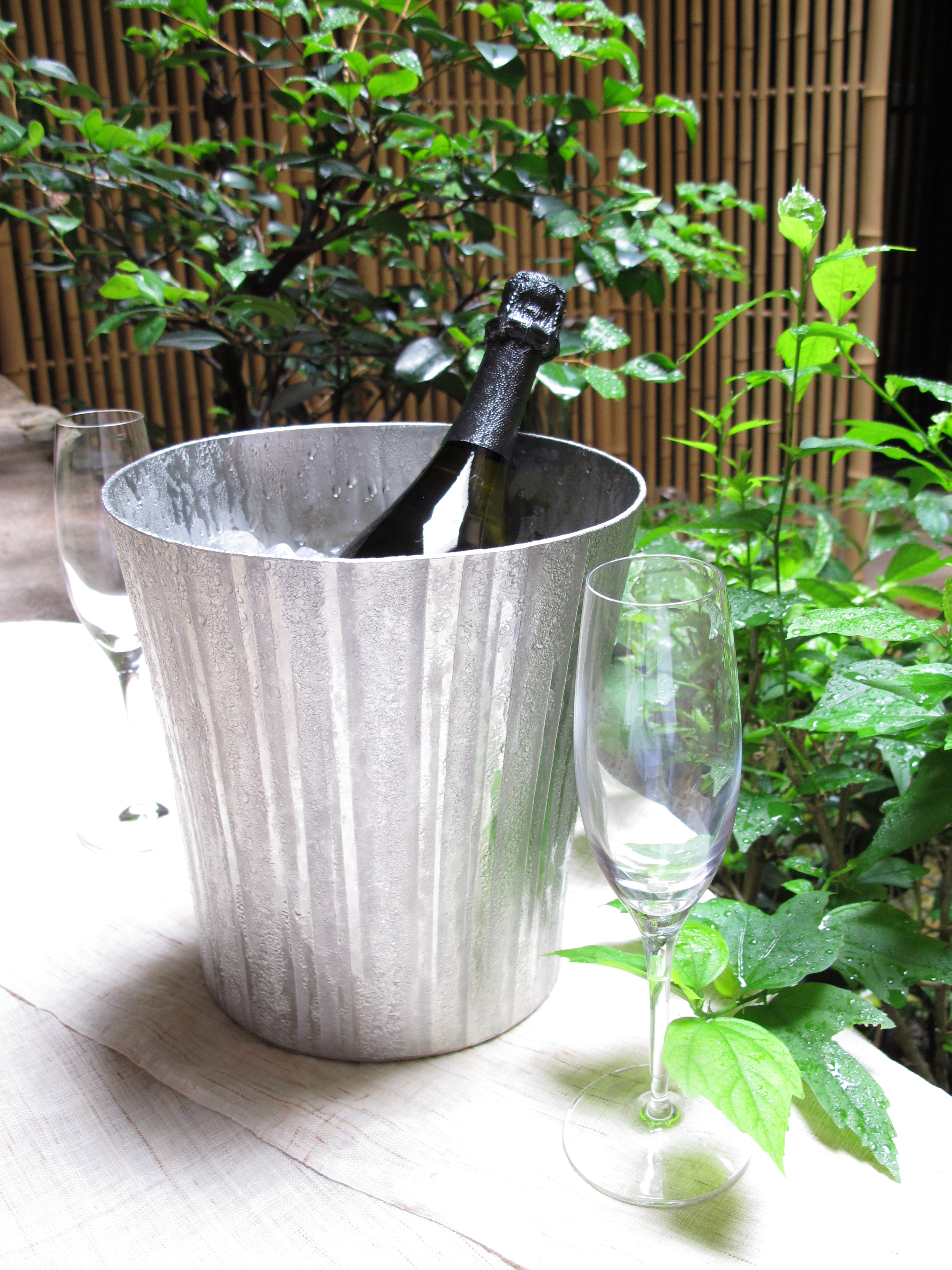 錫製のワインクーラー、「条文」。清潔感のある錫独特の淡い銀色をしていますが、中を氷で満たすと表面に冷たげな露がついてなおいっそう美しい肌を纏います。