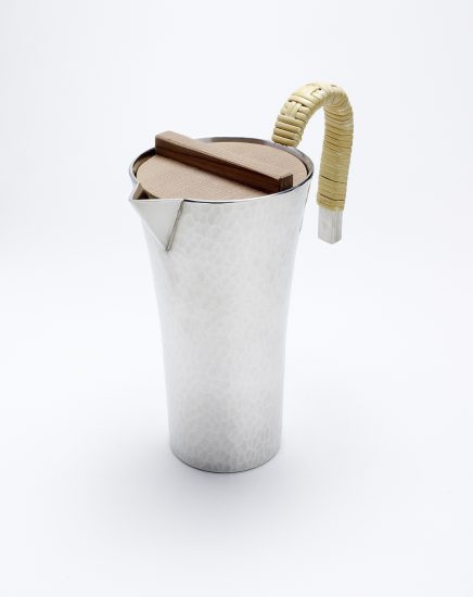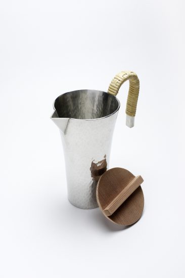 この度、清課堂では、鎚目(つちめ:金鎚の跡)模様を活かした銚釐(ちろり)を製作しました。お酒を美味しく温めることにこだわり、香りを逃さないよう、また冷め難いように杉製の蓋をつけております。容量1合のお酒を楽しむにちょうどいい大きさに仕立てました。京都ではとくに燗に適したこの形のちろりを「湯婆(たんぽ)」と呼んでいます。
