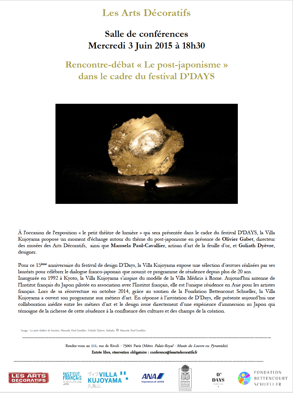 さて、本日6月3日午後6時30分から、パリの展示会場・Musée des Arts Décoratifs, Paris(パリ国立装飾美術館)の講演会場にて、villa九条山主催での トークが行われます。