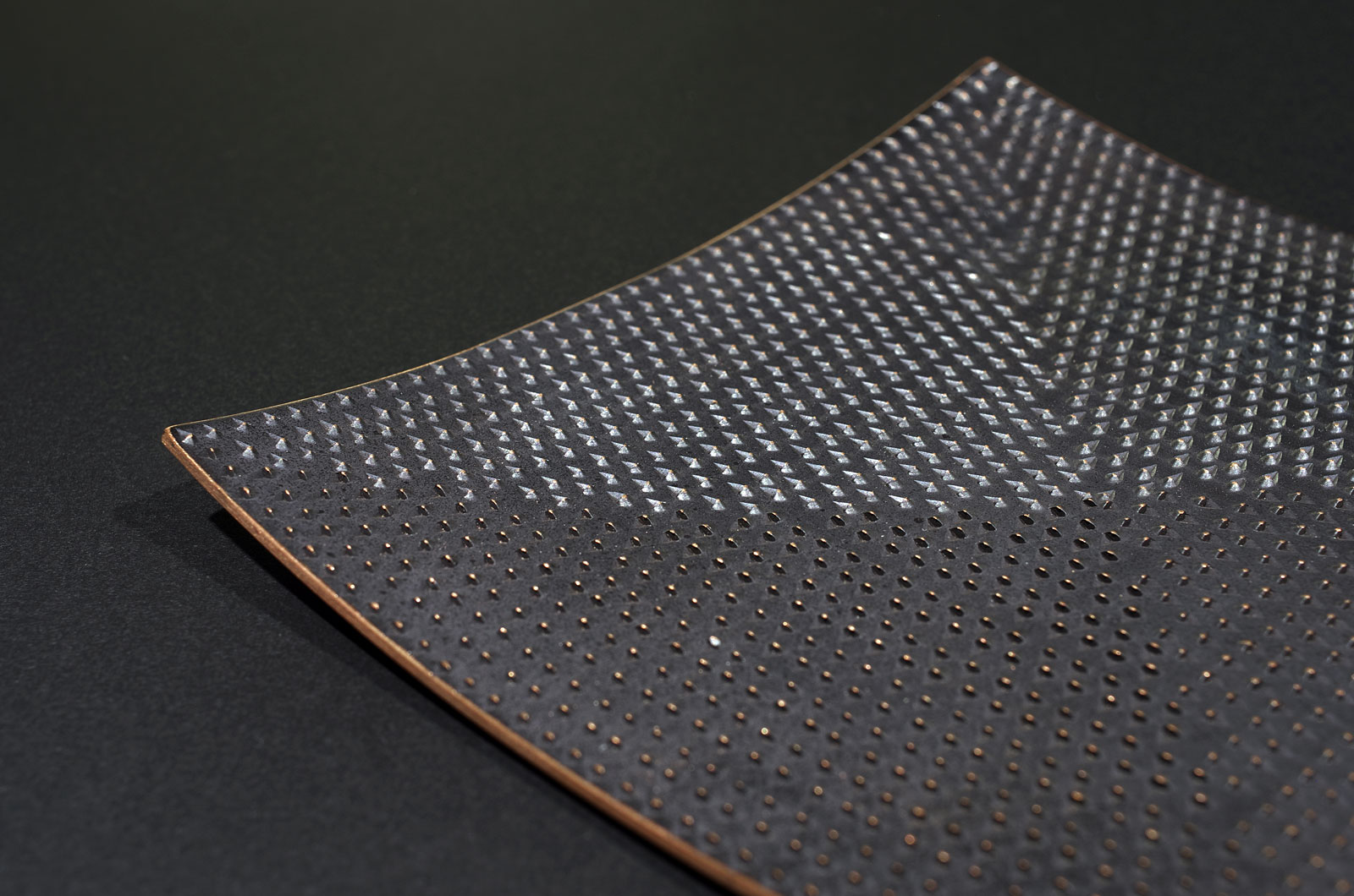 代表的シリーズ作品、“棘をもつ皿” 。まるでおろし金のように触れると痛く、触覚を体験しながらも、見る方向によって肌が変化し違って見える視覚効果も狙った近年取り組んでいる作品。展覧会期間中、銅板に鏨(たがね)を用いて目を立てるワークショップを行いました。