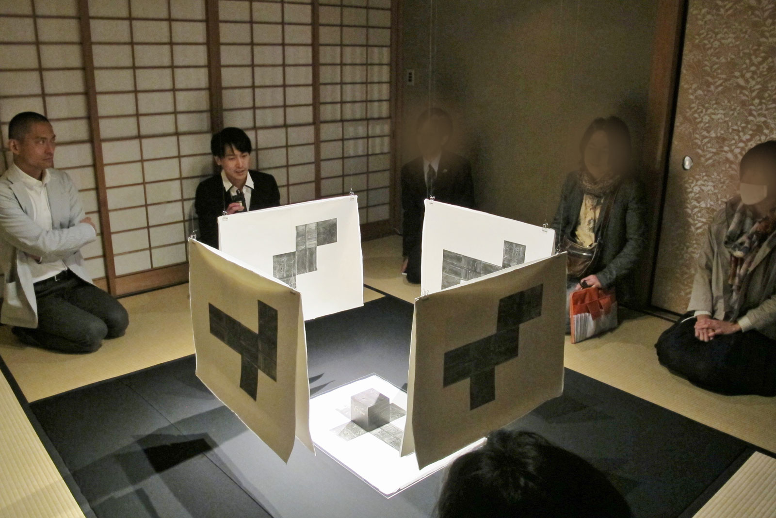 インスタレーション “cube tenkaizu” は、10センチ立方に切り出したダマスカス鋼の塊を版にし、6面ある波紋を雁皮刷技法を用い構成した作品。