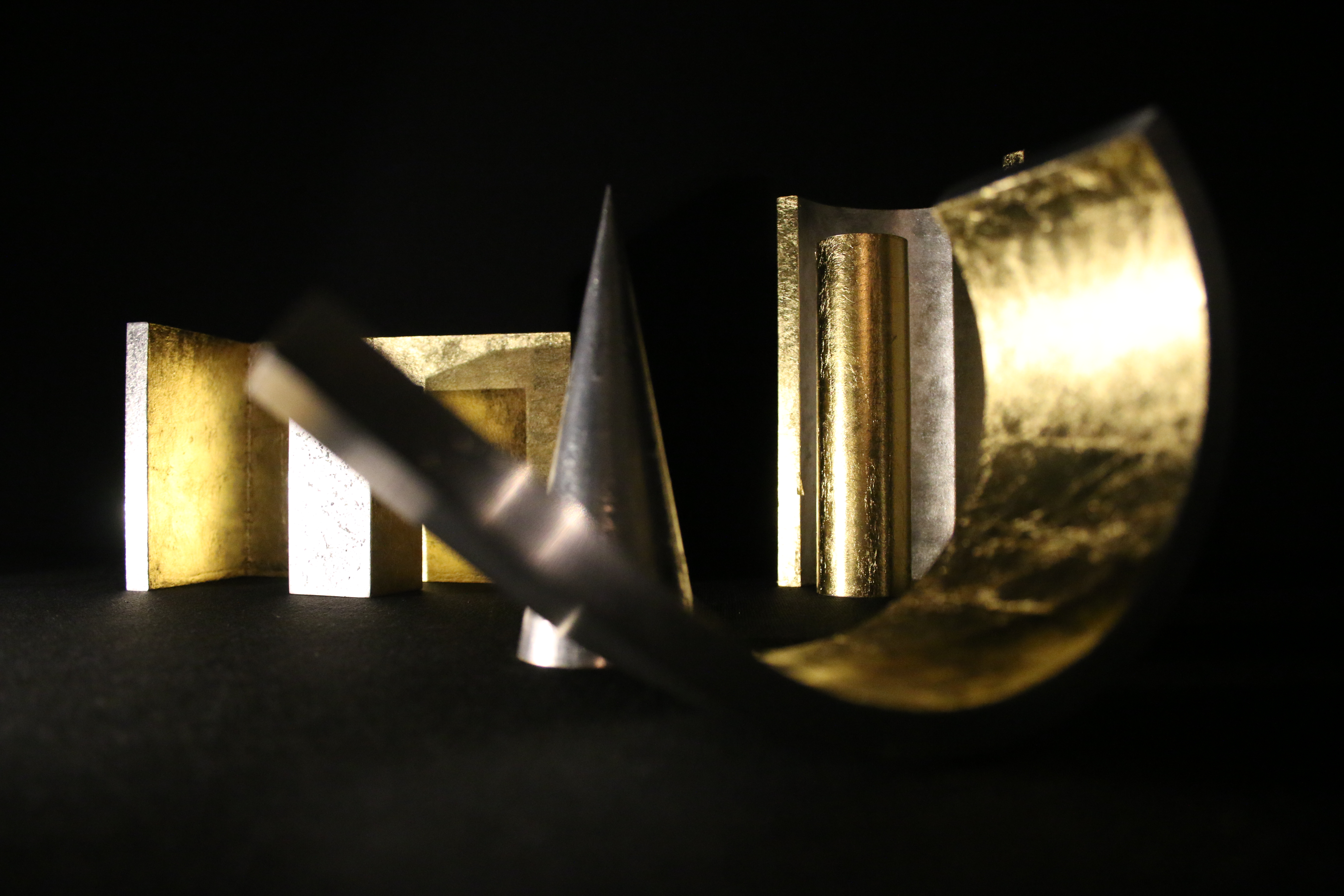 Gold leaf and tin illuminated in the light, contrasting with the shadow which it forms.