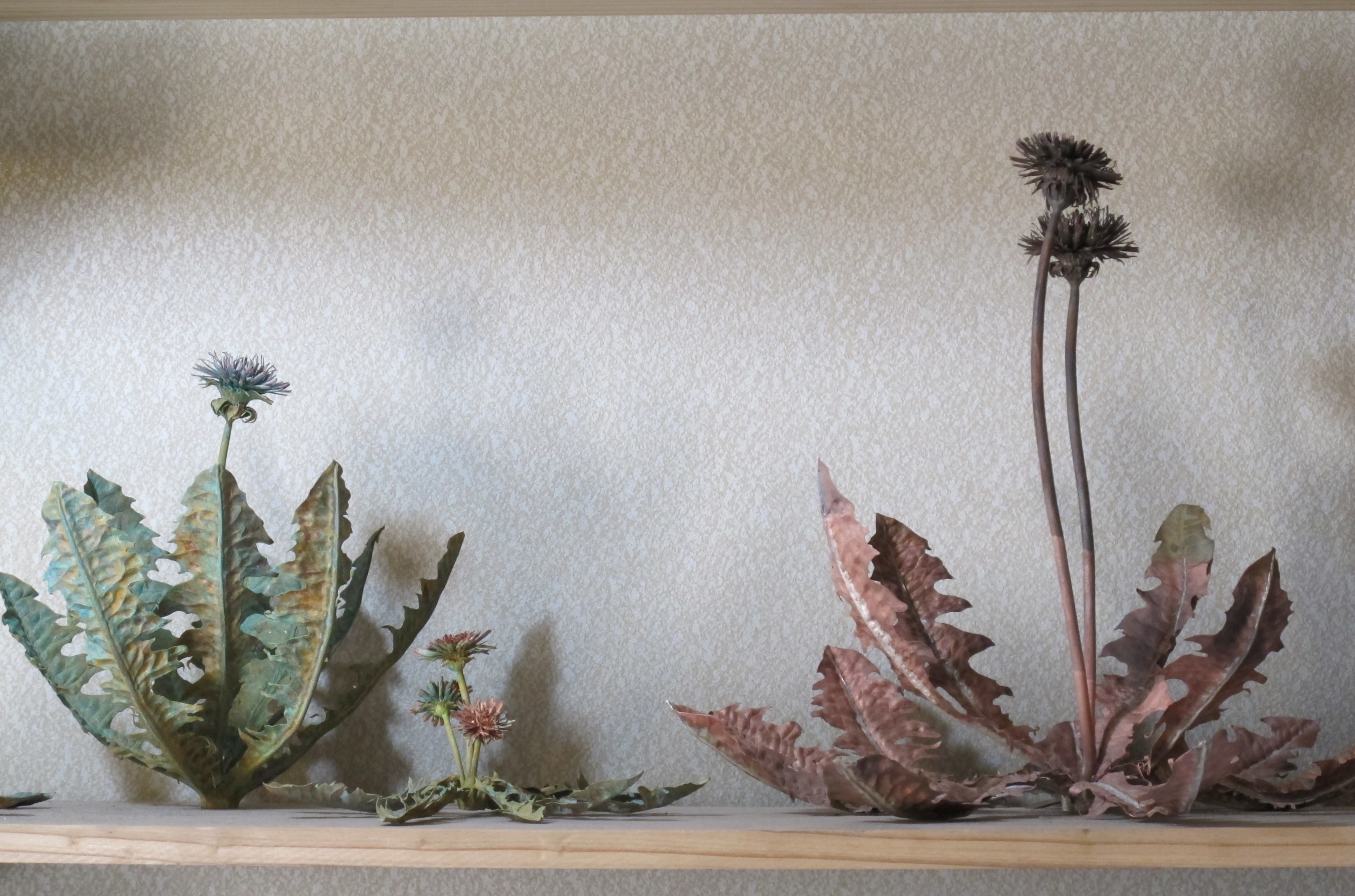 そう言いながら、鈴木はギザギザしたとげ状の葉に触れる。工房内の壁に設置された棚には、タンポポだけではなく、様々な植物が仕上げを待っている。春から初夏に花が咲く野草「オオイヌノフグリ」、鈴木が海外のギャラリーへ進出した国の一つ「スコットランド」の国花で、秋の野山を彩る「アザミ」、岩の上にも生える「ジシバリ」も、鉄の上で銅と銀の花を咲かせている。