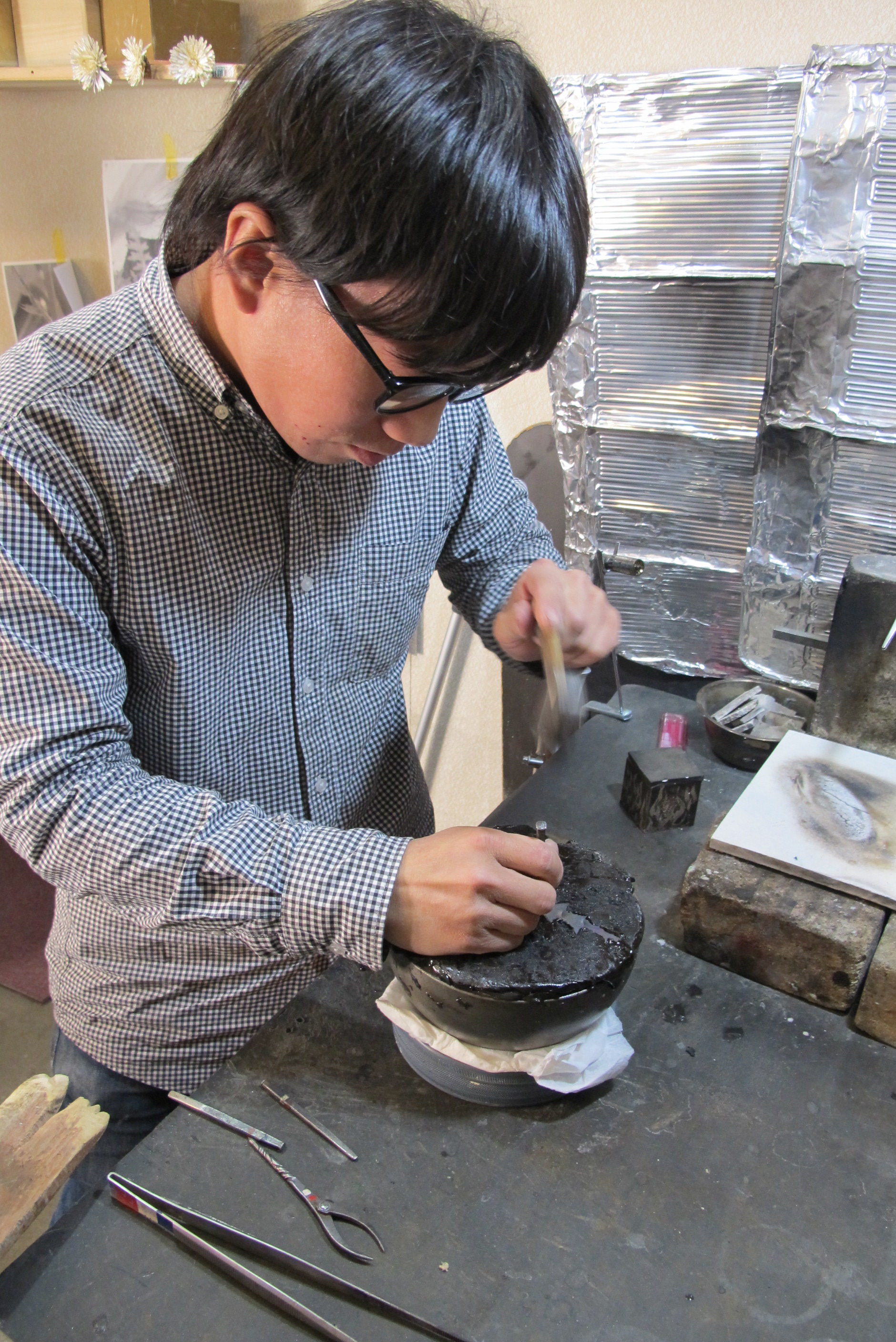 一軒家に組み込まれた屋根付き駐車場を改造した工房にツンとした匂いが漂う。黒い鋳鉄の半球(ピッチボール)に敷かれた松脂(まつやに)にバーナーで火をあぶる。熱で粘りつくように柔らかくなった松脂の中に、一枚ずつ切り出した葉の形をした銅を埋めて固定させる。鏨(たがね)を当て、大学時代から使っている小さな金槌の「福槌」で叩き、葉の筋を入れていく。